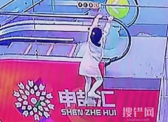 监控视频显示,一名女童双手扒在扶梯扶手处,随着扶梯上升,双腿悬空。之后被卡到扶梯与一面玻璃的夹缝处,情况十分危急。这时,两名男子见状,一同上前将女童解救下来。